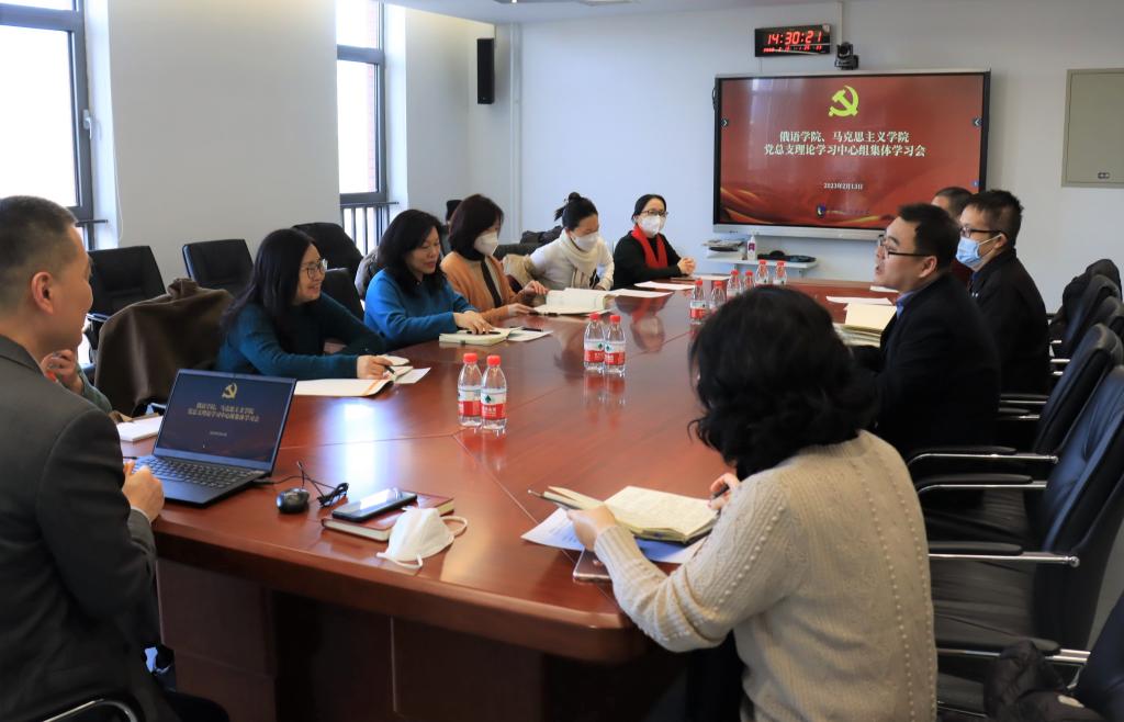 2月13日下午,为深入学习贯彻党的二十大精神,新葡8883官网AMG官网、俄语学院党总支理论学习中心组联合进行理论学习。新葡8883官网AMG官网院长韩强作题为“全面准确理解党的百年奋斗经验”报告。会议由新葡8883官网AMG官网党总支书记祝和军主持。新葡8883官网AMG官网、俄语学院党总支理论学习中心组全体成员参加联学。