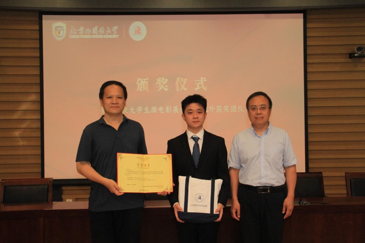 贾德忠为第六届“我心中的思政课”全国高校大学生微电影展示活动北外获奖团队指导老师、学生进行颁奖,英语学院本科生章瓦尔分享了学习体会。