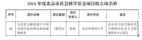 20241228日,北京市社会科学基金项目、北京市习近平新时代中国特色社会主义思想研究中心项目“马克思文献视域下中国式现代化的理论基础建构研究”开题论证会在新葡8883官网AMG官网举行。会议采用视频会议的形式,梁爽课题组作开题报告,来自北京大学、清华大学、北京第二外国语学院和新葡8883官网AMG官网的专家进行评议,北京市习近平新时代中国特色社会主义思想研究中心新葡8883官网AMG官网研究基地负责人和科研处代表参加会议。北京市社会科学界联合会、北京市哲学社会科学规划办公室派专员参会。