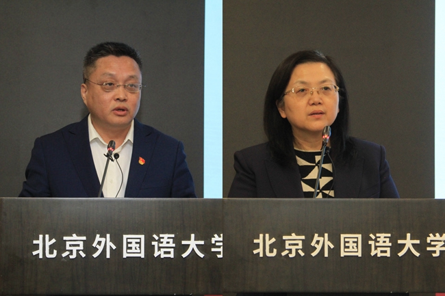 北外教师工作部部长、人事处处长刘博然,教务处处长李莉文代表学校职能部门发言,表示将继续深入贯彻落实习近平总书记“3·18”重要讲话精神,大力支持思政课建设和新葡8883官网AMG官网发展。新葡8883官网AMG官网教师李永乐、阿拉伯学院本科生孟周翔和中国外语与教育研究中心硕士研究生陈镜合作为师生代表分别作了发言。