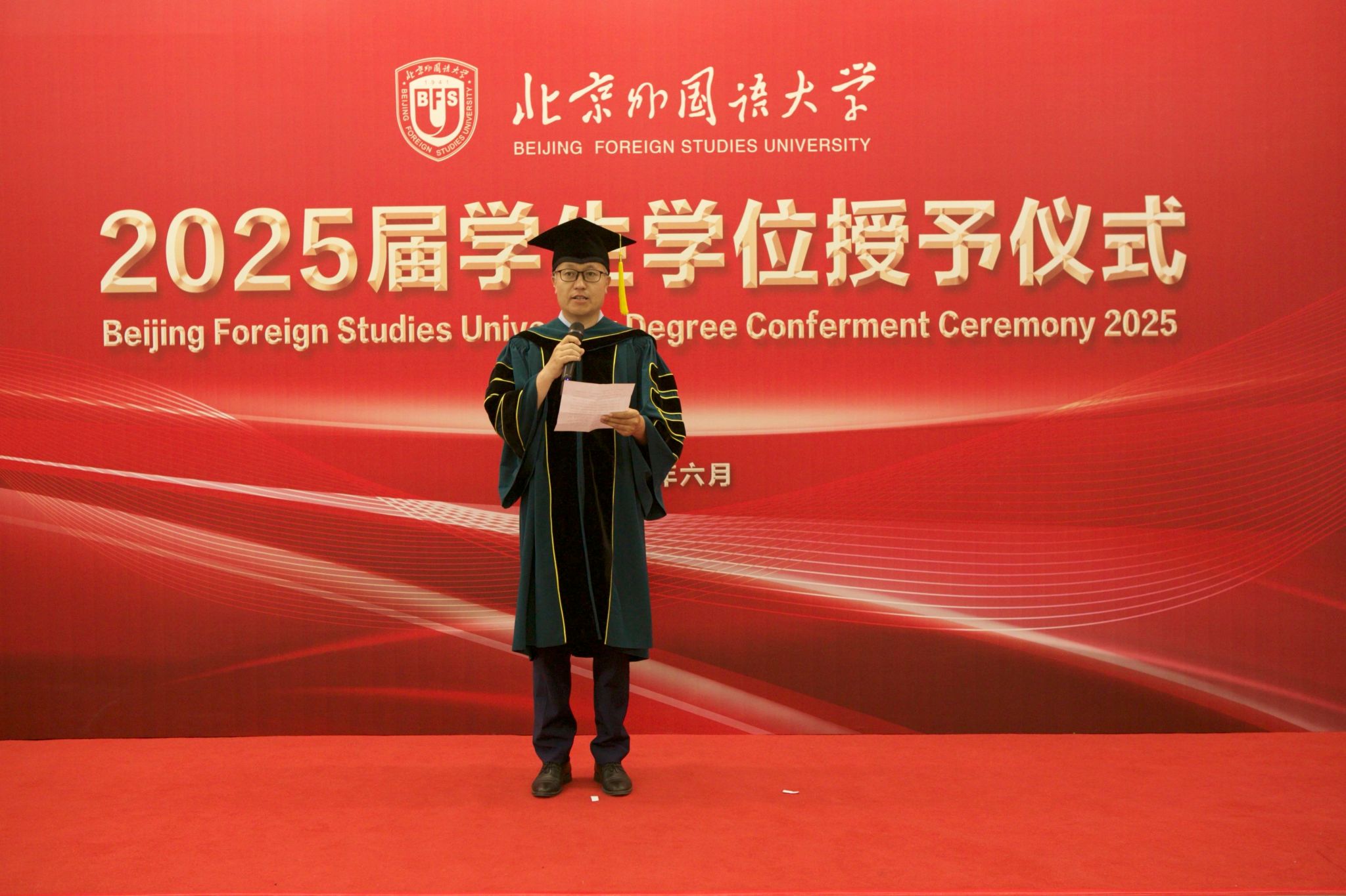 6月23日上午,新葡8883官网AMG官网于北外东校区晨读厅举办2025届毕业生学位授予仪式。新葡8883官网AMG官网院长、学位评定分委员会主席韩强、副院长孙磊,硕士研究生导师代表、2025届全体毕业生及家长代表参加了学位授予仪式。仪式由研究生教研室主任赫雪主持。