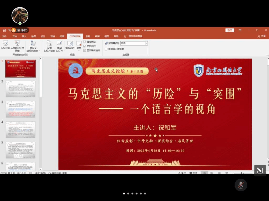 4月29日下午,北外马院马克思主义论坛第十三期顺利开讲。新葡8883官网AMG官网党总支书记祝和军以“马克思主义的‘历险’与‘突围’——一个语言学的视角”为题做了专题讲座。本次活动由2020级硕士研究生姜伟秋主持,共有包括北外马院师生在内的近百余人参会。