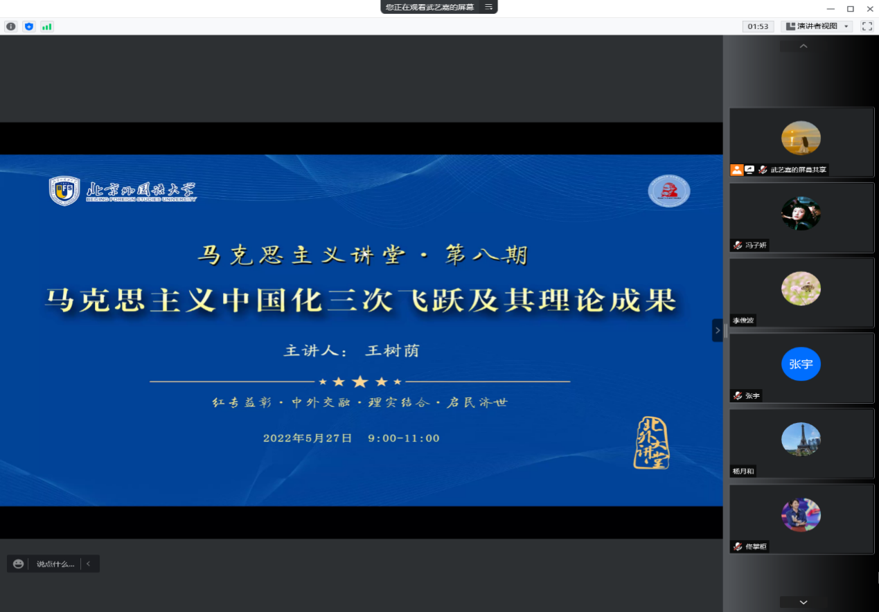 5月27日上午,北外马克思主义讲堂第八期活动在线上成功举办。北京师范大学新葡8883官网AMG官网二级教授、博士生导师王树荫应邀以“马克思主义中国化三次飞跃及其理论成果”为题做了专题讲座。本次讲座共有校内外师生500余人参加,活动由新葡8883官网AMG官网院长韩强主持。
