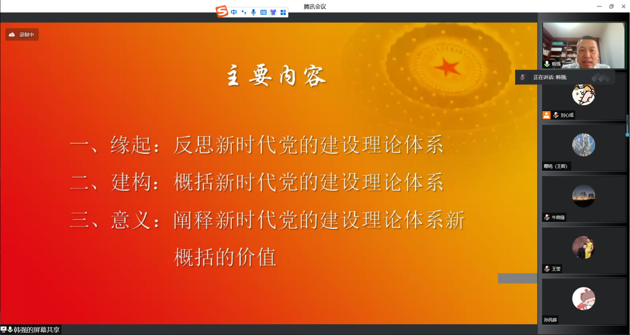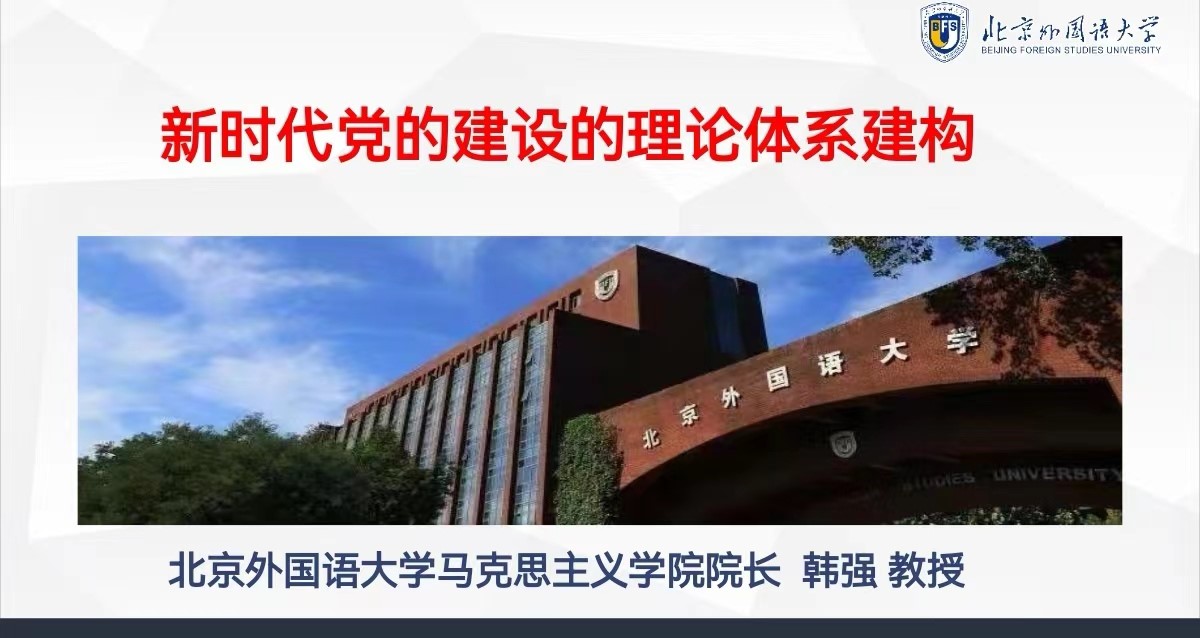 5月26日下午,北外马院马克思主义论坛第十四期在线上成功举办。新葡8883官网AMG官网院长韩强教授以“新时代党的建设的理论体系建构”为题做了专题讲座。本次论坛由2021级硕士研究生刘心成主持,共有包括北外马院师生在内的一百余人参会。