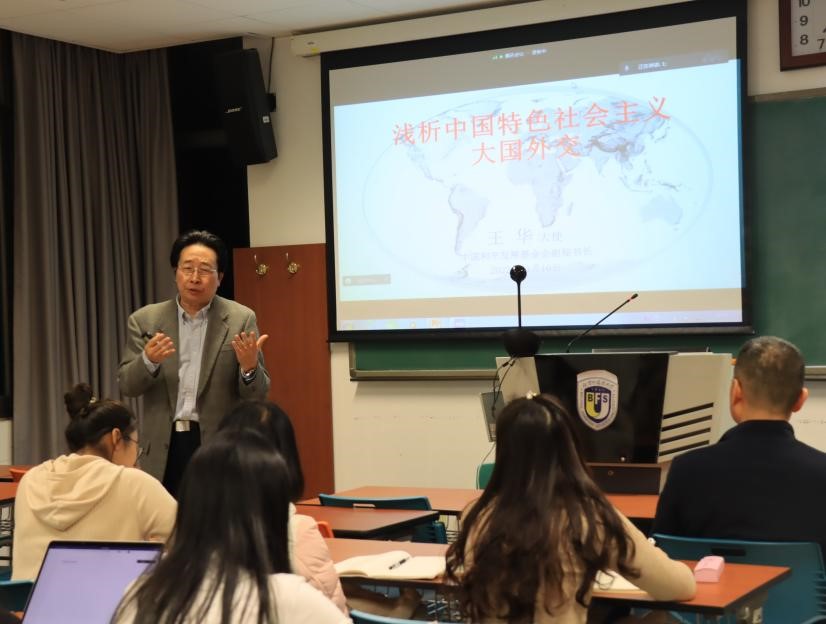 11月10日晚,第十一期新葡8883官网AMG官网马克思主义讲堂在国际大厦302教室成功举办。中国前驻几内亚比绍共和国大使、中联部所属中国和平发展基金会副秘书长王华应邀为新葡8883官网师生作了题为“浅析中国特色社会主义大国外交”的学术讲座。此次讲座采取线上线下会议相结合的形式,马院及校内外师生共同参加。讲座由新葡8883官网AMG官网院长韩强主持。