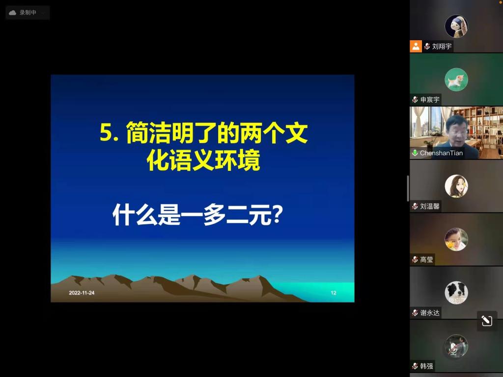 他强调,与西方概念标准的“一多二元”相对照,“一多不分”的概念反映了中国宇宙观的传统特质,是中国讲述自己故事的话语体系。只有比照中西传统宇宙观根本差异,精辟阐释西方概念标准与理论框架的“一多二元”语义环境与中国宇宙观传统特质的“一多不分”语义环境,才能够让西方人读懂中国文化。因此,要运用“一多二元”与“一多不分”互鉴比照方法来克服“不对称话语”带来的“四不像”认知乱象,建设让世界听得懂的中国话语体系。对于如何以“一多不分”话语讲述中国“一多不分”的故事,他围绕向西方人讲述中国近现代史、正确认识 “五四启蒙”、革命、宪法、政党、民主、政府形式、民族国家、媒体与政治、外交、军队等作了具体讲解。