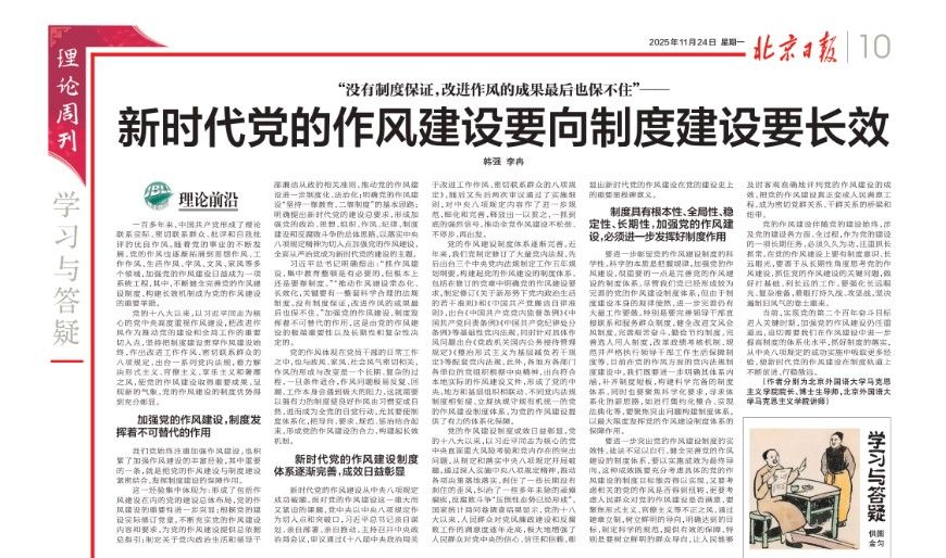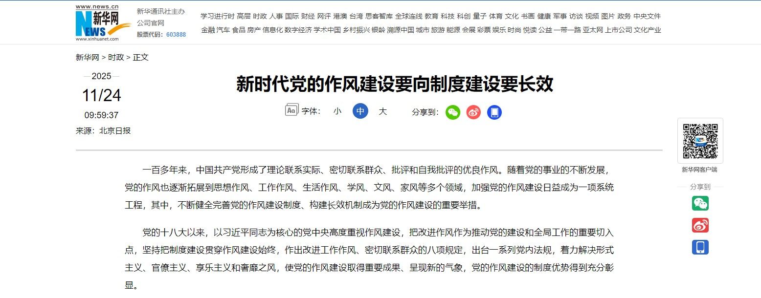 2025年11月24日,《北京日报》理论周刊刊发新葡8883官网院长韩强教授与青年教师李冉合作文章《新时代党的作风建设要向制度建设要长效》,新华网给予转发。
