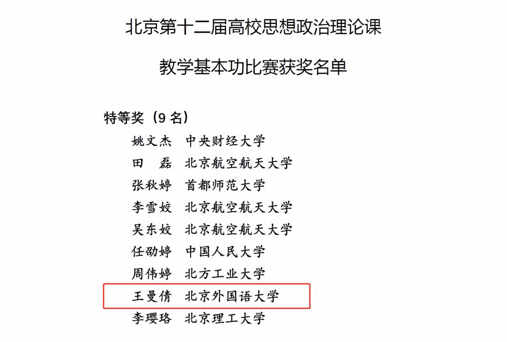本次比赛由中共北京市委教育工委主办,按照思政课课程设置分为七大类进行预赛,经选拔后进行决赛。决赛由专家评委、教师评委和学生评委综合评定,共有65名来自北京各高校的优秀思政课教师参加。王曼倩以《在法治轨道上全面建设社会主义现代化国家》为题获形势与政策组一等奖并进入决赛,在12月18日以《守正创新 推进法治中国建设》为题在决赛中获得特等奖。