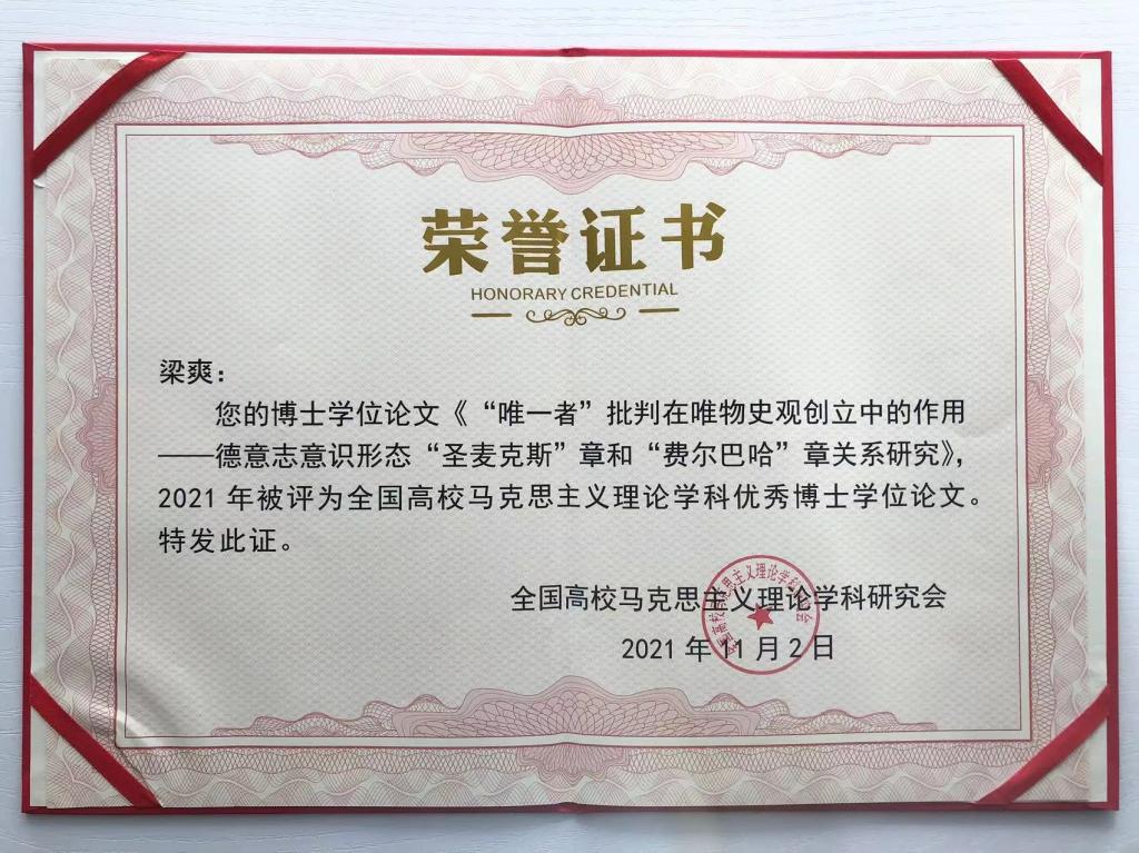 2023年11月4日,由全国高校马克思主义理论学科研究会主办的全国高校马克思主义理论学科博导论坛暨全国高校马克思主义理论学科优秀博士学位论文颁奖典礼在安徽师范大学举行,会议对2021—2023年度全国高校马克思主义理论学科优秀博士学位论文奖获得者进行了表彰。新葡8883官网教师梁爽获此奖项。