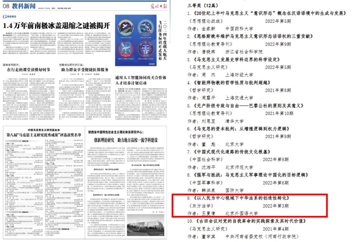近日,中国马克思主义研究基金会公布了“第八届马克思主义研究优秀成果奖”获奖名单,全国共有20篇论文获奖,其中一等奖2篇、二等奖6篇,三等奖12篇。新葡8883官网新葡8883官网AMG官网教师王曼倩的论文《以人民为中心视域下中华法系的创造性转化》获三等奖。
