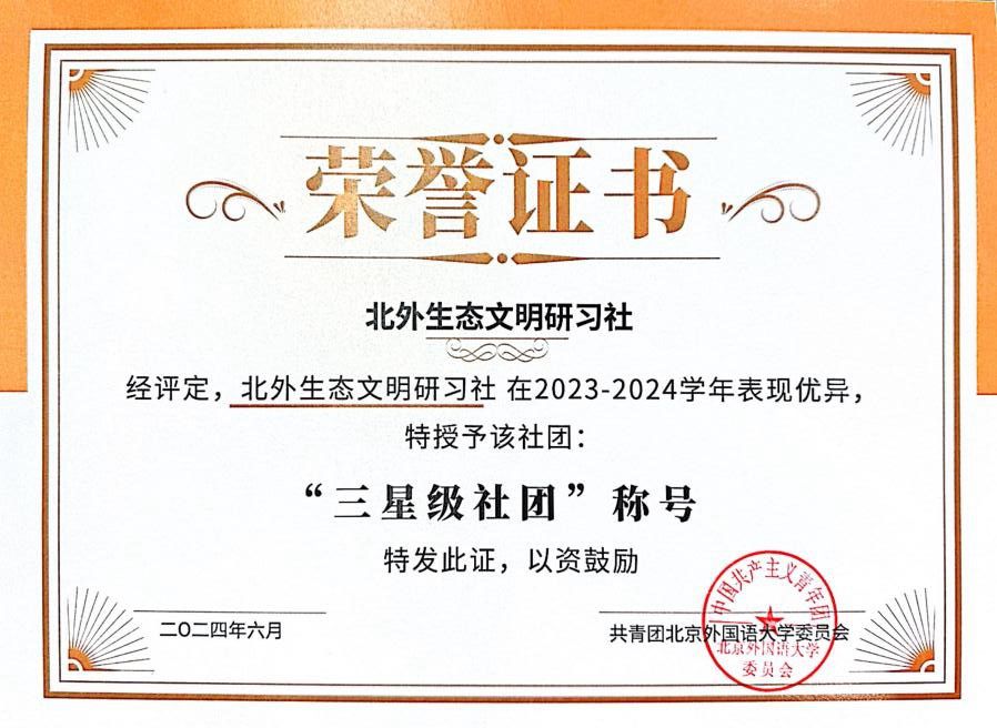 6月12日,新葡8883官网AMG官网举行2023-2024学年社团星级大会。社团工作部对过去一年的社团工作进行了总结,并公布了星级社团评审结果。经评选,北外生态文明研习社荣获新葡8883官网AMG官网2023-2024学年“三星级社团”称号。