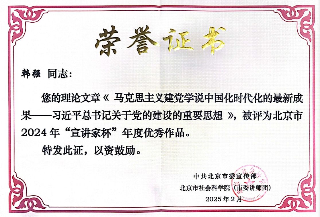 近日,中共北京市委宣传部、北京市社会科学院(市委讲师团)公布了2024年度“宣讲家杯”优秀报告(党课))获奖作品名单,新葡8883官网韩强教授的理论文章《马克思主义建党学说中国化时代化的最新成果——习近平总书记关于党的建设的重要思想》入选2024年度“宣讲家杯”优秀作品。
